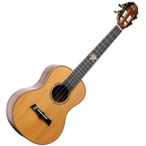 Snail tenor ukulele featuring a solid top, cedar back and sides, and an ebony laminate fretboard. A quality instrument for discerning players.