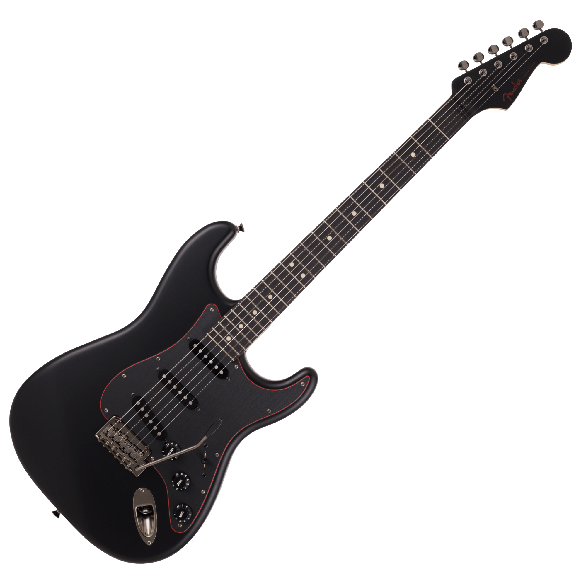 Made in Japan Limited Hybrid II Stratocaster®, Noir is based on the Hybrid II, with a satin black finish matching headstock for a strong look and a 3-Ply black pickguard with an eye-catching red center layer. It is equipped with a special atmosphere combined with the red metal logo on the head. All metal parts and plastic parts are unified in black, and also equipped with a Synthetic Bone Nut, 9.5-inch-radius fingerboard, Narrow-tall frets providing a modern feel and comfortable playability.