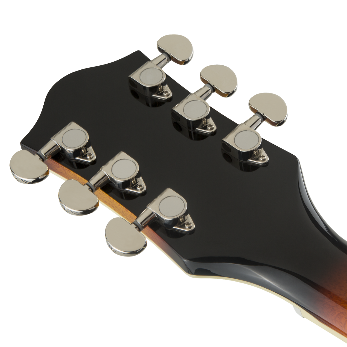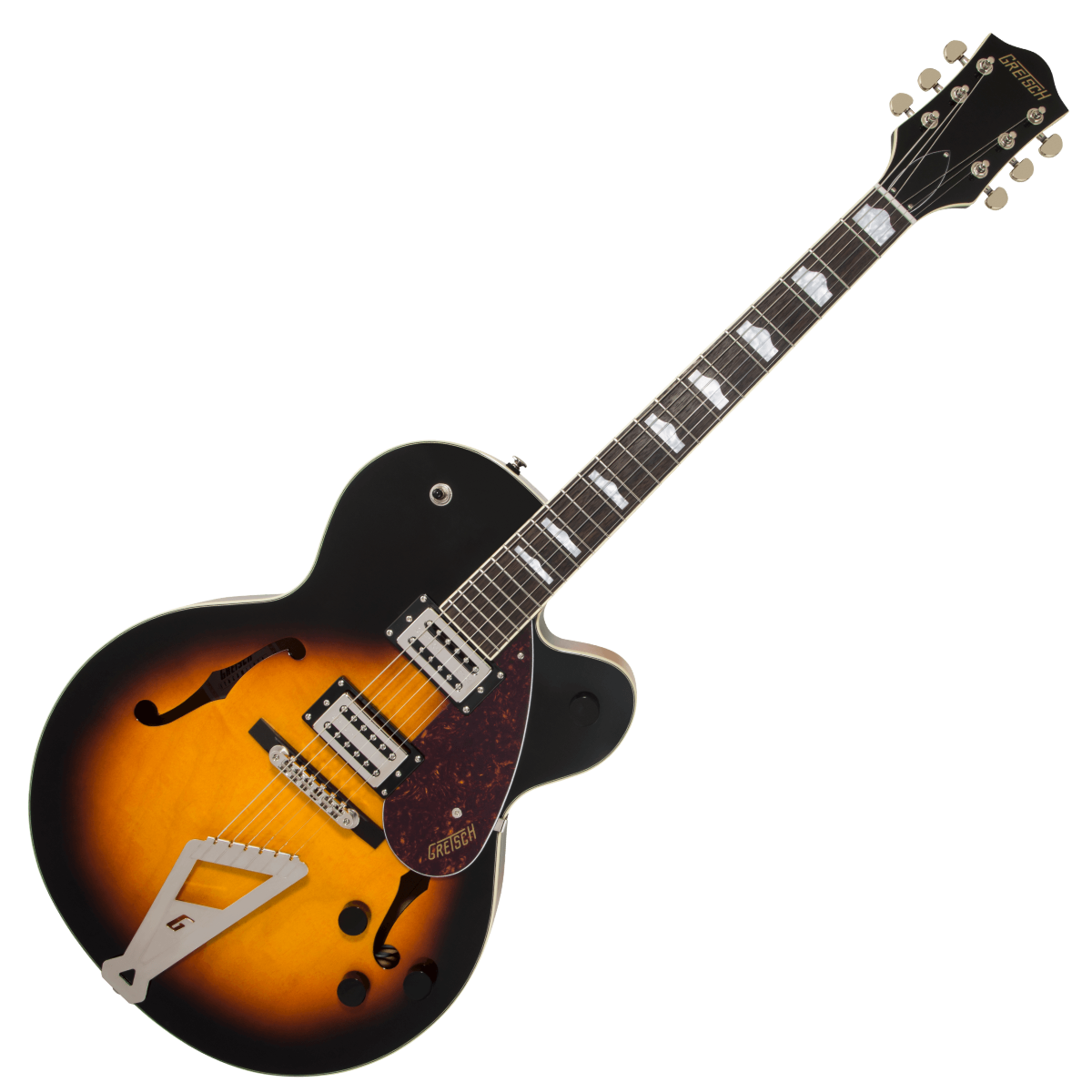 All the classic eye-catching style you’ve come to expect from Gretsch is here – vintage-style black control knobs, enlarged F-holes for increased acoustic projection, elegant aged white binding with upgraded purfling, slick-looking nickel hardware, arched laminated maple construction and three-ply tortoise pickguard. Nearly impossible to put down once you pick it up and start playing, the G2420 is an astounding take on the authentic sound and classic style you’ve come to expect from Gretsch.