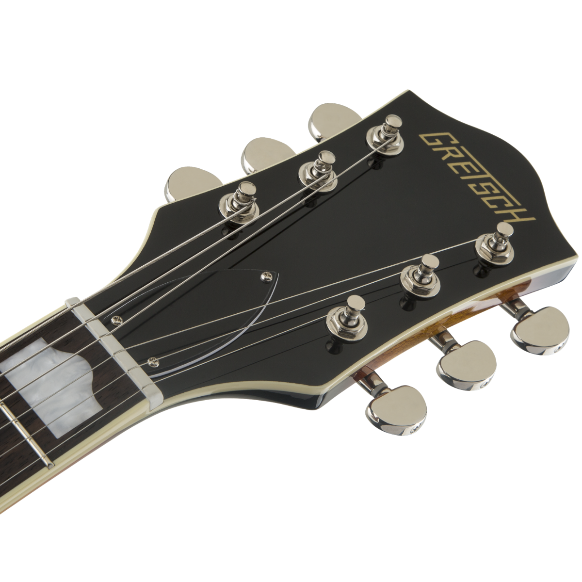 The secret to the Streamliner’s sound is a new offering from Gretsch – the Broad’Tron™ BT-2S humbucking pickup. Designed specifically for the Streamliner Collection, the high-output Broad’Tron pickup spawns improved definition with tighter bass response for robust lows, pristine highs and a throaty midrange. This sonic power is harnessed and shaped by the traditional control layout – neck and bridge pickup volume controls, a master tone control, master volume control and three-way pickup switching. A fast-playing 12″-radius laurel fingerboard with elegant pearloid Hump Block inlays and 22 medium jumbo frets sits atop the white-bound nato neck with a thin “U”-shaped profile – ideal for chord work or firing off speedy riffs. Enjoy rock-solid tuning stability courtesy of the stylish Gretsch Chromatic II tailpiece, Adjusto-Matic™ bridge with secured laurel base and synthetic bone nut.