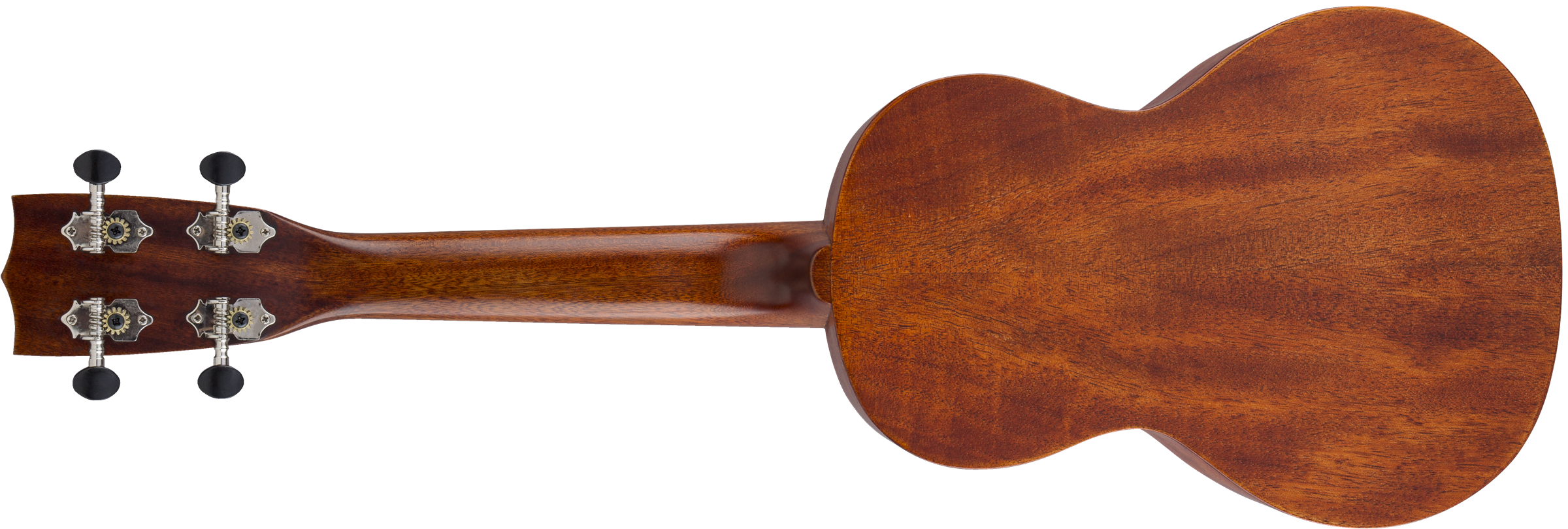 Its premium features include a 15″ scale length, an ovangkol biscuit bridge puck with maple saddle, mahogany top, back and sides, one-piece mahogany neck with bone nut, ovangkol fingerboard with 16 frets (12 to body), Grover® 9NB Sta-Titeâ„¢ geared tuners, Aquila® Nylgut® strings and deluxe fitted gig bag.