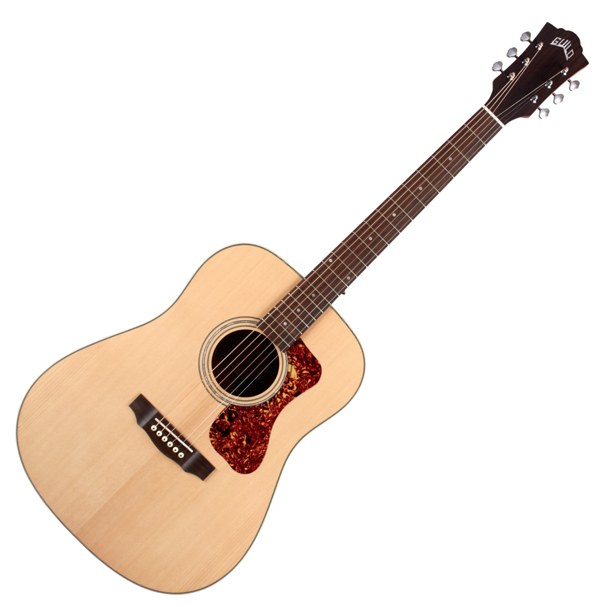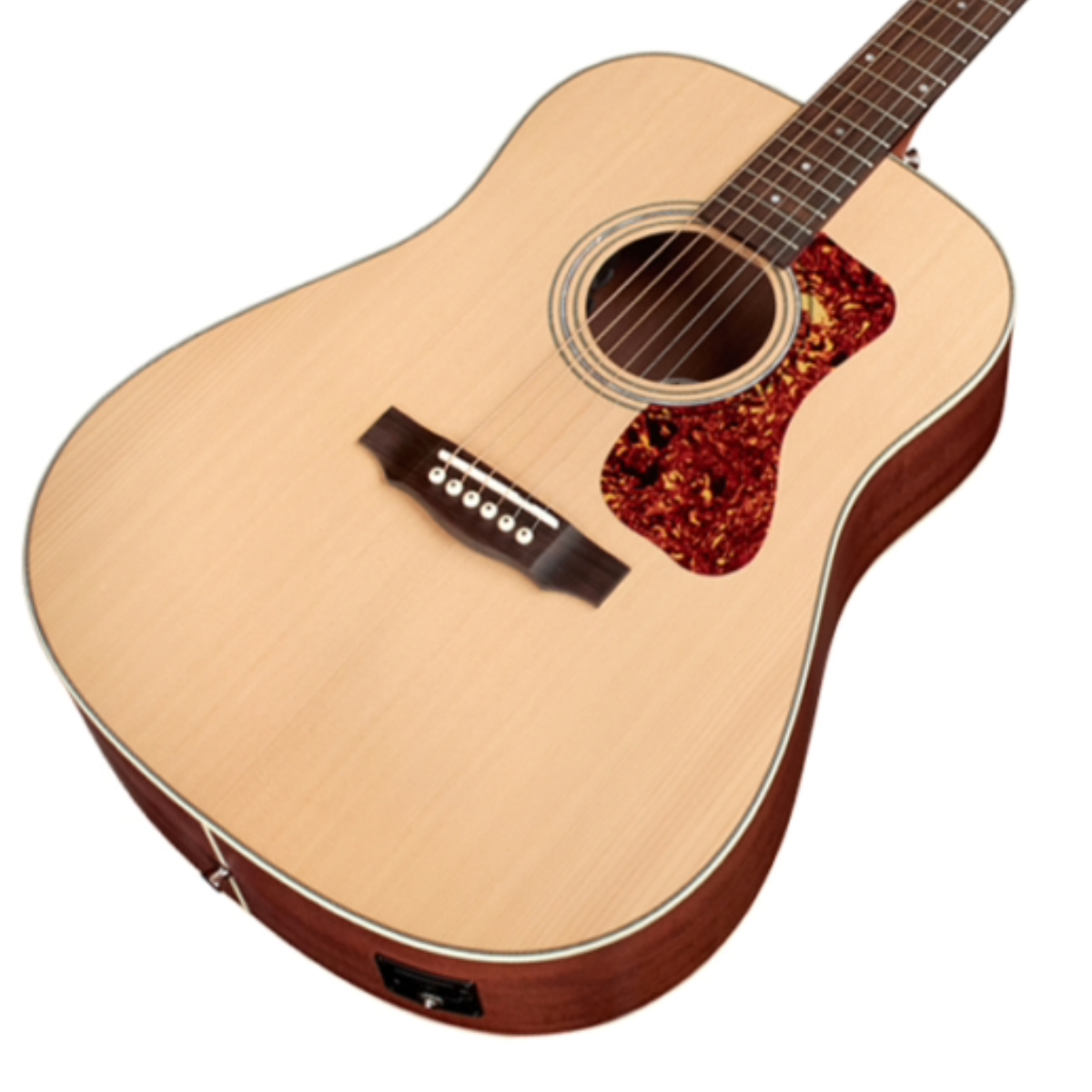 Built with a solid spruce top, mahogany sides, and arched mahogany back, the full-bodied and powerful tone of this Guild dreadnought provides guitarists with a classic acoustic sound and balanced voicing. Guild’s signature arched back design allows for great volume and projection, long sustain, and a lush, full sound. The D-240E features Guild’s Fishman-designed GT-1 Pickup System, a Pau Ferro fingerboard and bridge, bone nut and saddle, mother-of-pearl rosette, period-correct tortoiseshell pickguard, and a matte polyurethane finish.