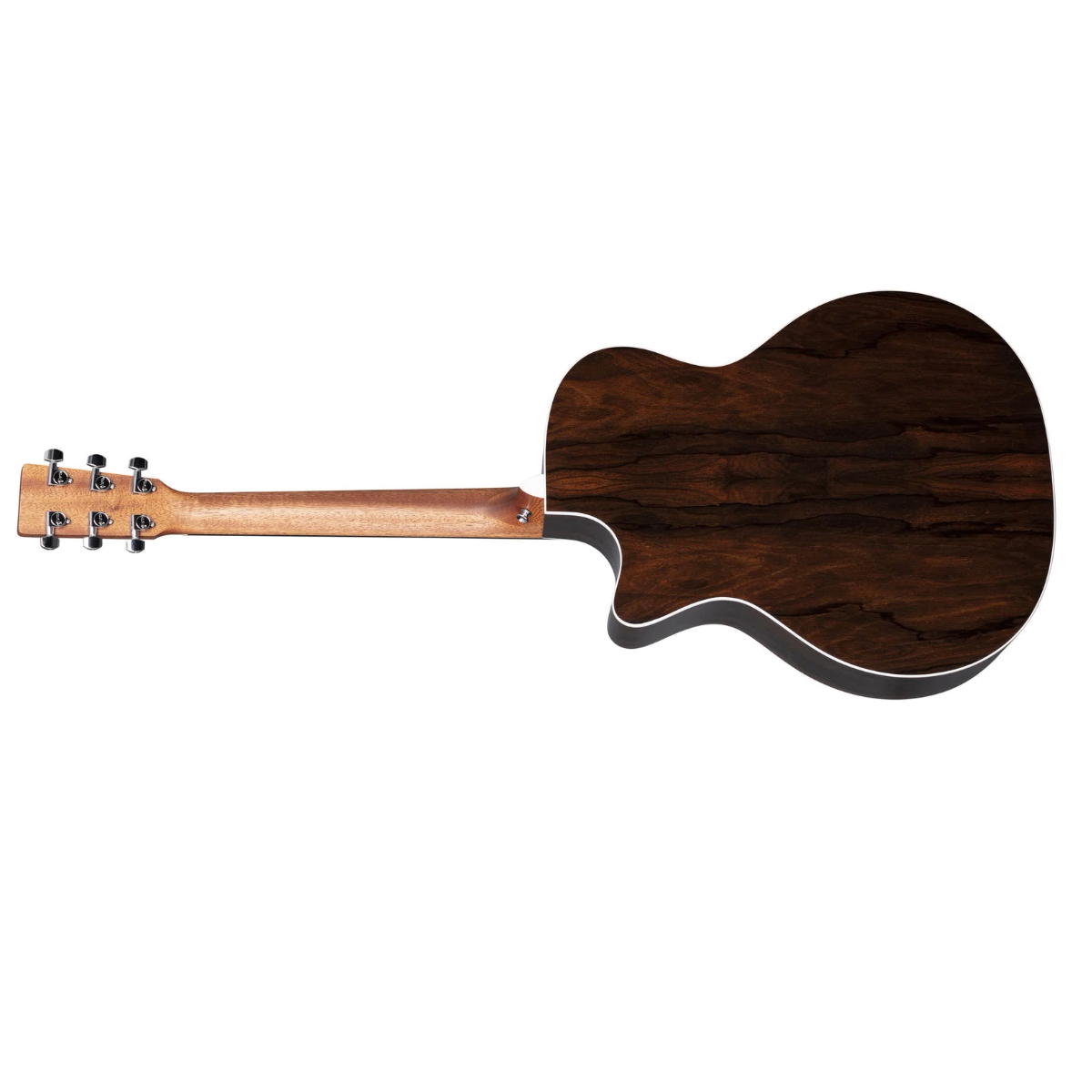 With a gorgeous glossed spruce top and ziricote back and sides, this Grand Performance cutaway model is a great sounding guitar at an affordable price. New to this model are stunning mother-of-pearl pattern fingerboard and rosette inlays, a multi-stripe rosette border, and white binding. It has an FSC® Certified Richlite® fingerboard and bridge, gloss body, and a hand-rubbed neck finish. Also new to this model is a Martin E-1 electronics package with a built-in soundhole tuner so you can tune up any time without using a pedal. This guitar comes with a burst option and Premium Soft Shell Case so it is Road-ready to join you on all of your adventures!