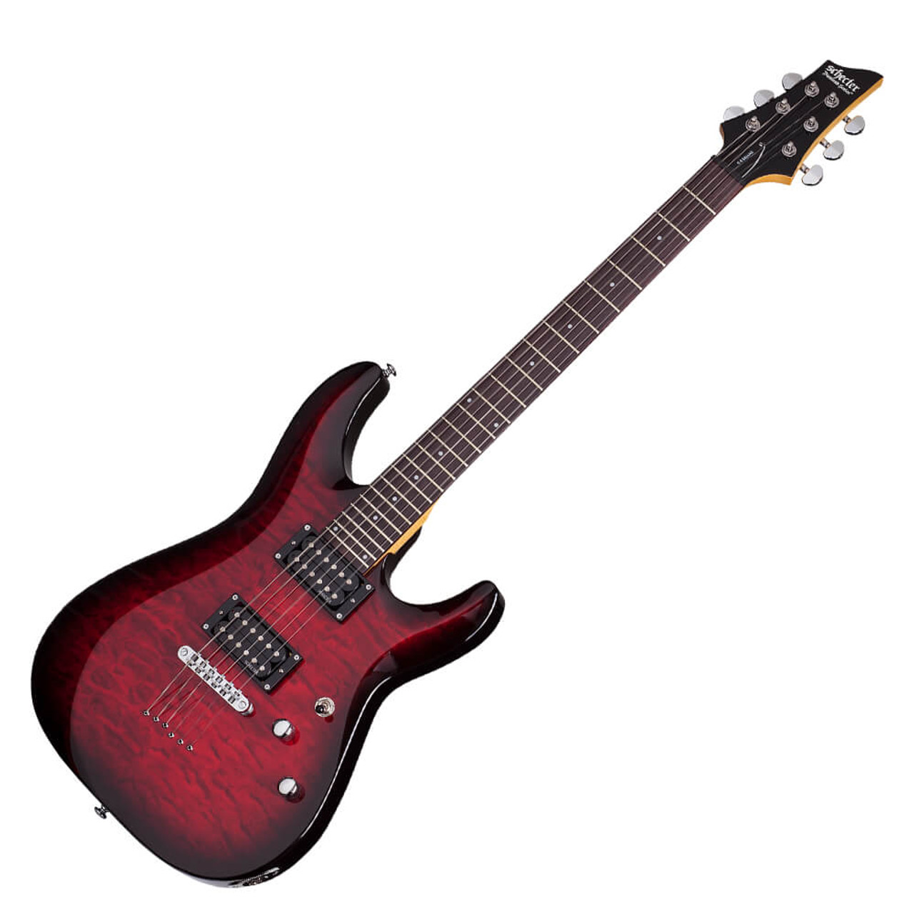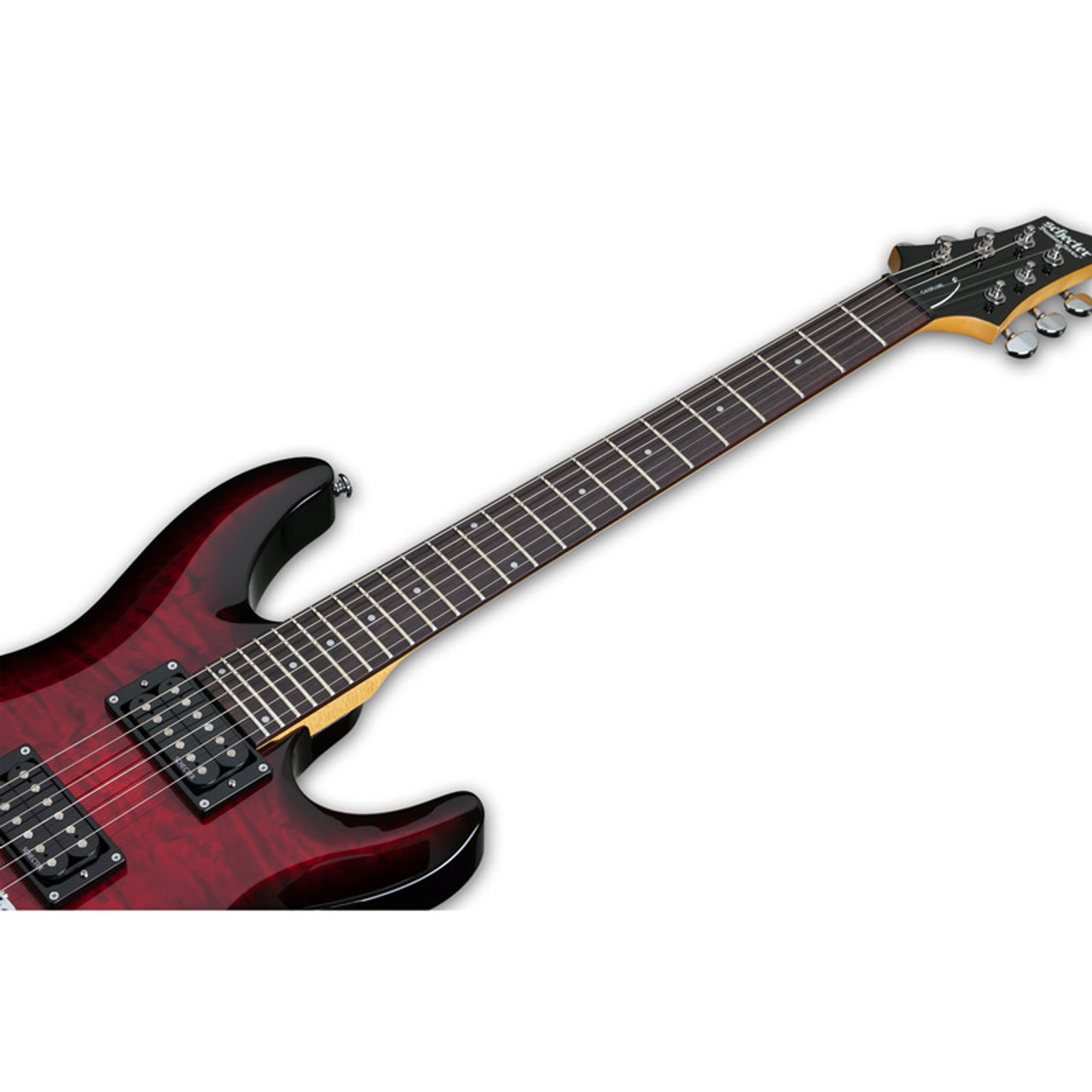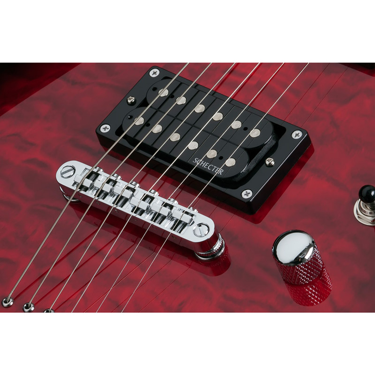 The C-6 Plus series is based on the Deluxe series, but the basswood body is visually enhanced by a quilted maple design ceiling. The screw-on maple neck with Thin-C profile has a rosewood fretboard with a scale length of 25.5 inches (648mm) and 24 X-Jumbo frets. Both pickups are Schecter Diamond Plus. The bridge is a Tune-O-Matic with String Thru Body and the tuners are also from Schecter.