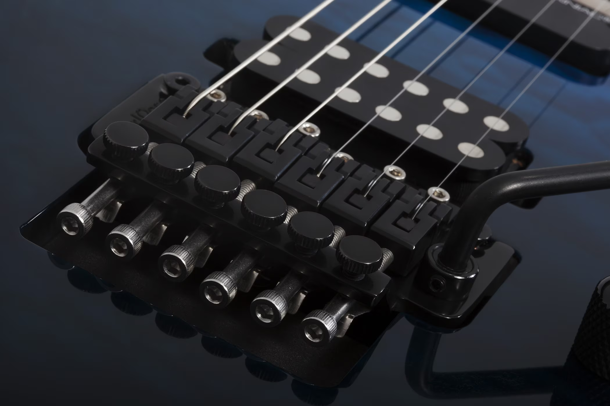 The Floyd Rose® vibrato system, developed by Floyd D. Rose in the 1970s, is a widely used, advanced system for electric guitars. Thanks to its double locking system, the guitar remains in tune, even during extreme bends and dives. This flexibility, including pull-up and dive bomb, makes it particularly popular with rock and metal guitarists. Fine adjustment is carried out precisely using micro adjustment screws, some models also offer fine tuning screws on the string riders for precise control of the tuning.