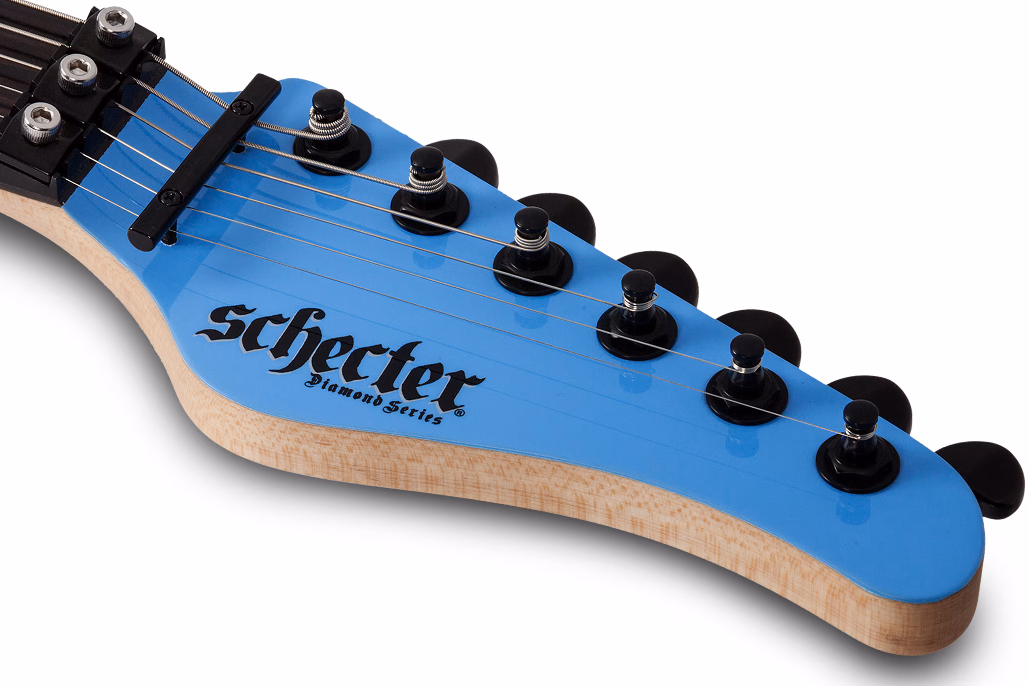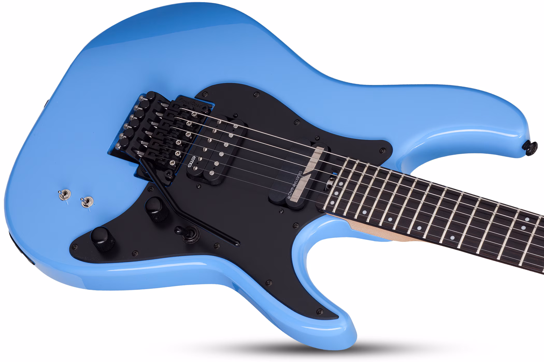 Schecter Sun Valley Super Strat in Riviera Blue with Floyd Rose tremolo. An electric guitar designed for high performance and exceptional playability.